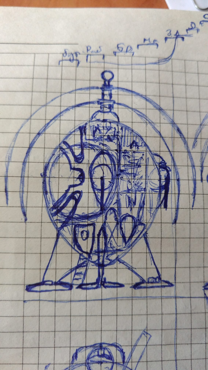 Когда я вернулся я как мог попытался нарисовать это летающее яйцо, не судите строго не художник однако могу пояснить что посадочные концевые лапки раздвигающиеся при посадки для большего пятна опоры в полёте служат рулями управления. Кресло пилотов, а их почему то два, хотя мне показалось что для полёта хватит и одного совмещено со всеми приборами и средствами управления во время взлёта, посадки и разных режимов полёта меняет свой наклон относительно аппарата оставаясь примерно к поверхности под одним углом. В самих оружейных башнях могут находится стрелки для них предусмотрены места, на случай применения против яйцелётов электромагнитного оружия, а так орудиями управляют три независимых автомата (компьютера) которым оператор задает режимы поражения или целеуказания всё остальное они делают сами и находят цели и определяют свой чужой степень угрозы для яйцелёта, порядок поражения, наводят и производят выстрел одиночным или несколькими снарядами подряд. Сами снаряды используют трёх типов обычные скоростные, с насадкой самоподрыва на определённом расстоянии (получается конус из осколков поражает как наша шрапнель) и с дальним точным наведением они больше длиннее и выстреливаю по одному уж и не знаю как там у них меряется расстояние но я в переводе на наши образы зафиксировал более 15 километров.