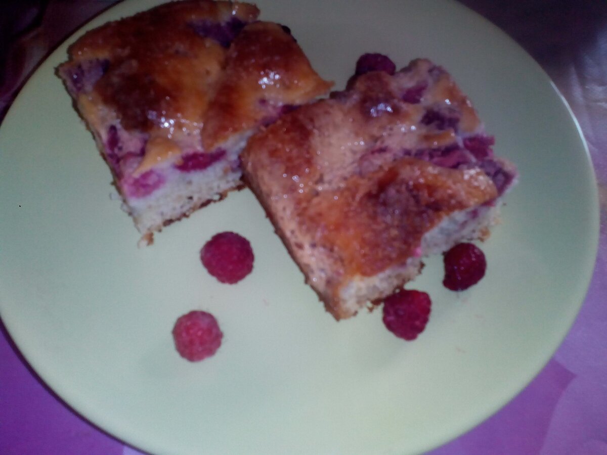 Выливаем 1/2 часть теста в форму, сверху кладем малину (примерно 200 г.) и второй частью теста заливаем малину.