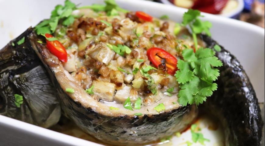 Карпа почистить и сделать надрез по спинке вдоль спинного плавника. Подрезать ребра и вырезать хребет. Выпотрошить и хорошо помыть. Хвост не разрезайте, иначе не получится красивой формы. Рыбу посолить и поперчить внутри и снаружи. Карпа красиво расположить в форме для духовки. Форму смазать маслом. Если рыба заваливается на бок, то можно подложить с той стороны скатанную в комок фольгу, чтобы она поддерживала в нужном положении. Нафаршировать карпа гречкой с груздями. Полить оливковым маслом начинку и саму рыбу — голову, бока, хвост. Поставить в духовку на 40-50 минут. Температуру включить на 170-180°С. Прикрыть карпа фольгой, а через 30 минут её снять. Важно не пересушить рыбу!