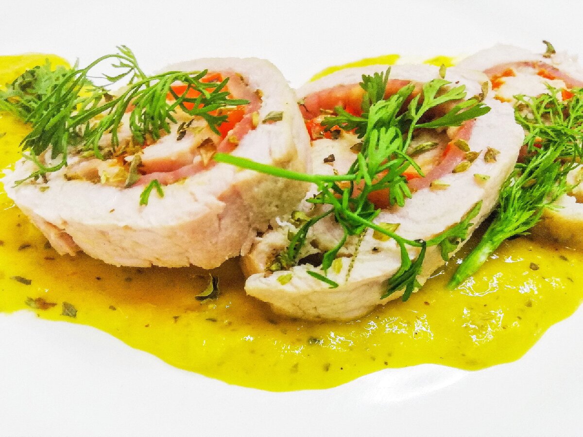 Если вы хотите чтобы рулет выглядел запечённым, вам просто нужно поджарить свинину, прежде чем нарезать ее