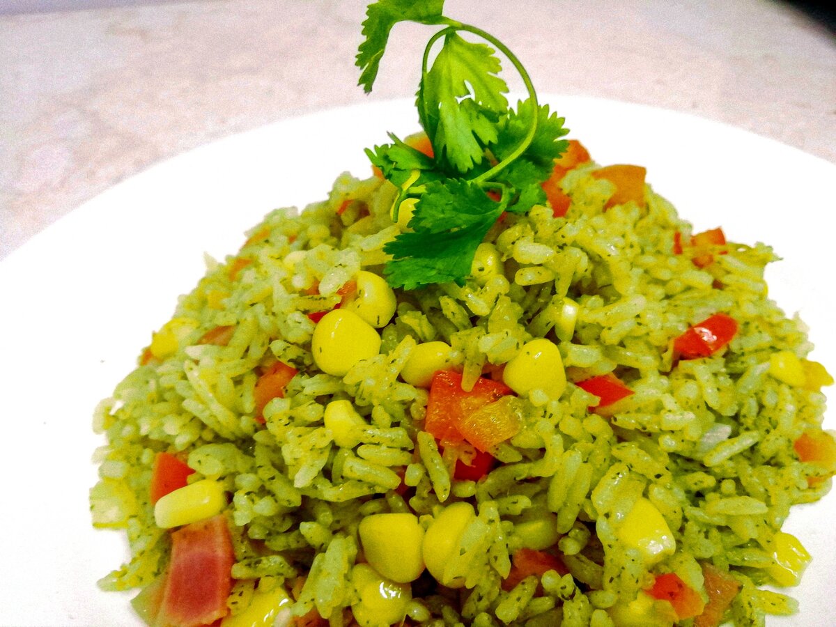 Добавляем эту смесь в наш рис и когда рис готов, мы добавляем овощи по вкусу (я использовала кукурузу, Бекон и паприка