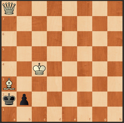 Очередная шахматная задача. Автор задачи П. Рожков, 2007 год. Черная пешка грозно стоит на b2. Ей всего один ход до ферзя. Однако белые начинают и ставят мат в 2 хода.