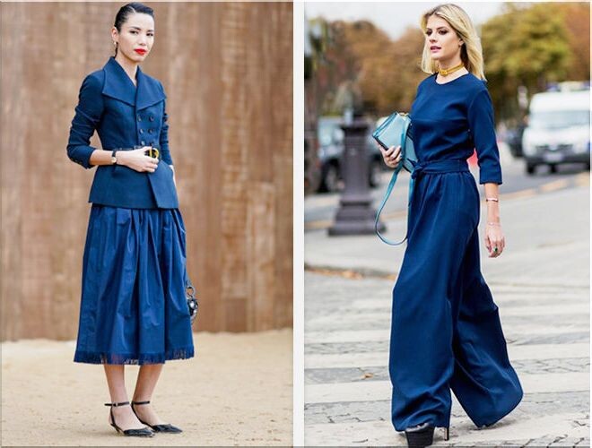 Темно-синяя гамма часто применяется в офисном стиле, так как помогает создать деловые образы. Ключевой основой может являться строгий костюм с юбками или брюками. Добавляя к нему белую водолазку или батник, можно реализовать и нарядный образ, и деловой. Элементы такого ансамбля можно носить как по отдельности, так и вместе, дополняя их другими цветовыми оттенками.