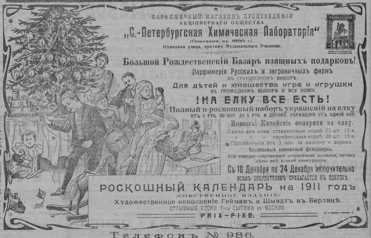 Предрождественские газеты Саратова в 1910-х гг пестрели рекламой, которая предлагала приходить в магазины города за подарками. Устраивались распродажи, ярмарки, анонсировались поступления необычных продуктов. Предлагался большой выбор новогодних украшений — парафиновые свечи разных цветов, зажигательные нити, «волшебные» японские звезды.