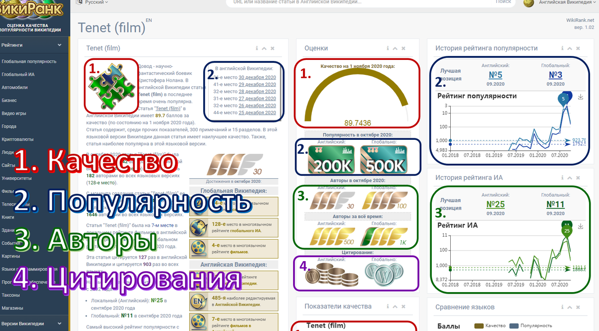 Отдельно можно проверить популярность и качество любой статьи Википедии на определённом языке. Например профиль статьи Википедии о фильме «Довод» (Tenet) с информацией о популярности представлен ниже:
