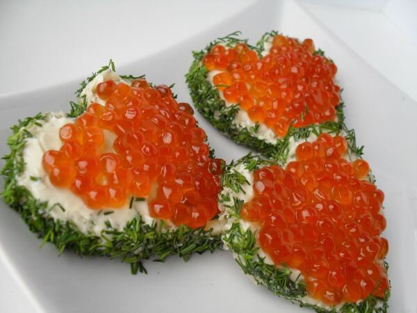 - Смажьте маслом верх и края будущего бутерброда. Окуните торцы в укроп. Уложите заготовки на блюдо, на каждую положите чайную ложку икры.