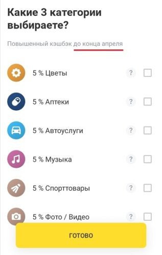 Категории можно выбирать сроком на 1 месяц 1 раз в месяц. Единоразово можно выбрать не более трёх категорий. Сумма повышенного кэшбэка по данным категориям составляет 5%.