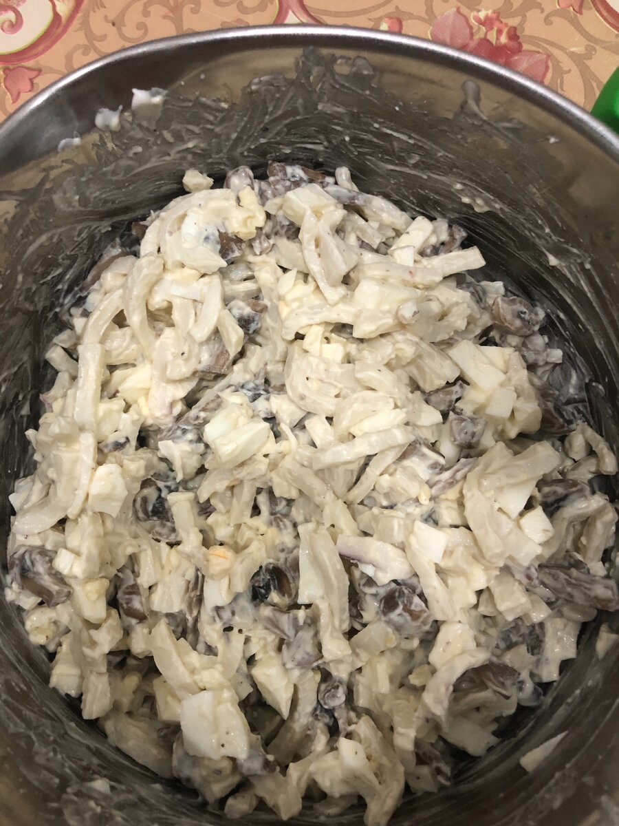 Когда ну совсем нет времени готовить, предлагаю вашему вниманию этот салат! Состав: Кальмары 500 гр. Яйца 5 шт. Шампиньоны 200-250 гр.