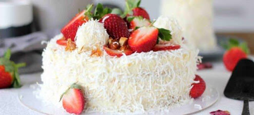 Смазать кремом бисквитные коржи. Бока и верх торта также смазать кремом, а в завершение украсить торт конфетами и остальными кокосовой стружки. При желании можно добавить и другого декора, например кондитерских бусин. Убрать торт на 3-4 часа в холодильник, затем подавать к столу.