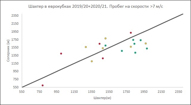 Пробег на спринтах не является бесполезной статистикой - при грамотном использовании он может быть полезным индикатором. Для этого необходимо четко понимать стиль игры команды и как при хорошо проведенном матче в этой манере выглядят фитнес-показатели. К примеру, если взять последние 18 игр Шахтера в еврокубках (+7=6-5), то все их лучшие матчи (+6=2-0) придутся на диапазон их собственного пробега на спринтах 1700-1900, где при этом они чуть перебегали соперника. Это были их лучшие игры не потому, что они много пробежали на спринтах, а потому что они хорошо сыграли в своем стиле игры - и показатели в данном случае могут быть полезны для тренера, но не несут в себе особой ценности в отрыве от установки и стиля игры. Заметьте, что здесь есть совершенно конкретный диапазон (к примеру, они ни разу за 18 игр не вышли за 2000, и корреляция между двумя пробегами в их матчах примерно те же 0.7), и при этом средний результата Шахтера (1584 метра) незначительно превосходит усредненный результат РПЛ.