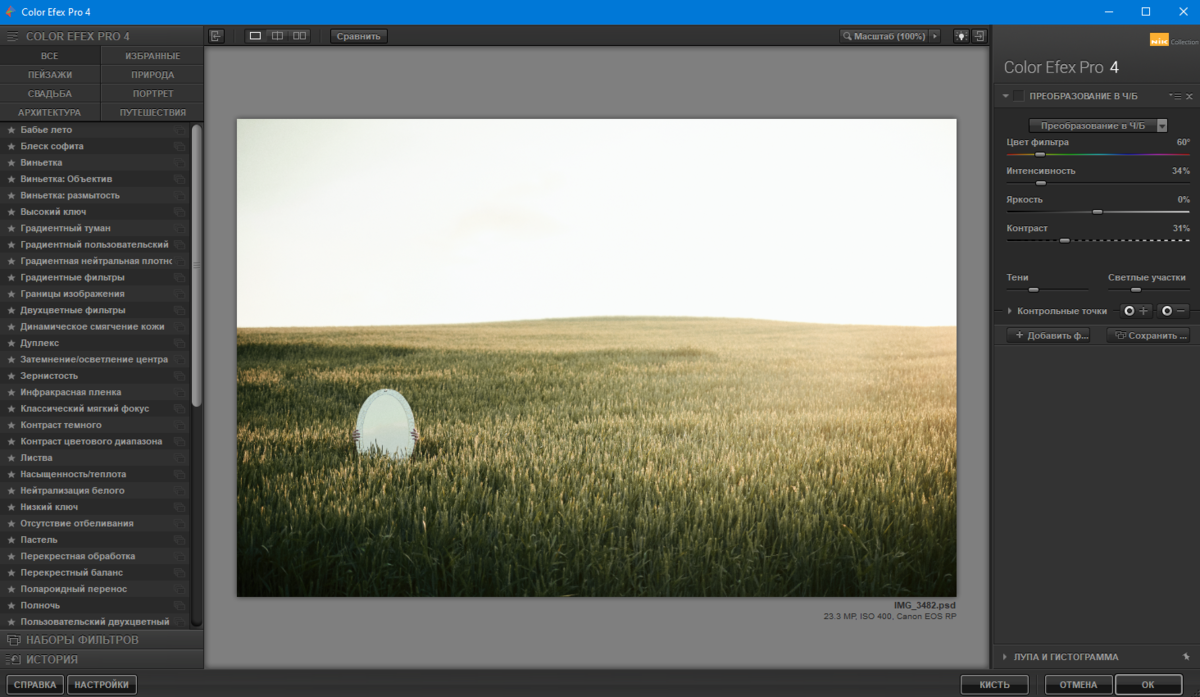 Весь плагин состоит из 107 киношных фильтров. Тут есть пресеты от тумана до зерна. Фильтры разделены по вкладкам : портреты, архитектура, природа и свадьба. В каждом фильтре настраивается мягкость эффекта, выраженность в темных или светлых участках и т.д. Вот небольшой лайфхак. Чтобы фотография смотрелось однородной, я добавляю шум в конце работы. В моих последних фотографиях, я пользовался зерном из этого плагина.