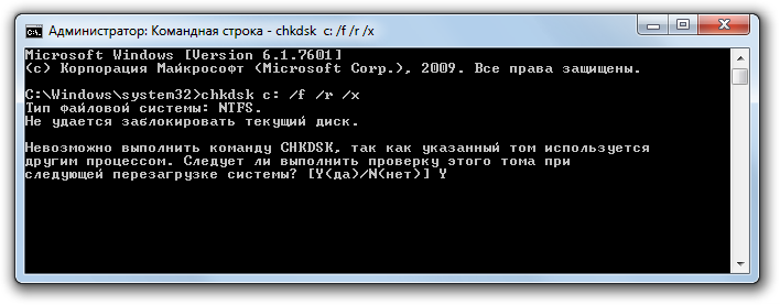 Если вы увидите сообщение о том, что нельзя выполнить команду CHKDSK, так как указанный том используется другим процессом, нажмите Y (да), Enter, закройте командную строку и перезагрузите компьютер. Проверка диска начнется автоматически при начале загрузки Windows.