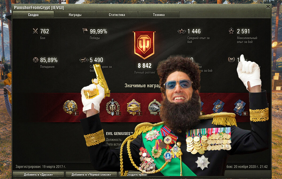 Посмотришь на статистику этого игрока и подумаешь: "Да какой же это ряженый, рачина ж обычная!..". И правда, 46% побед, 160 среднего урона, не самый лучший игрок. Но посмотрите, сколько танков у него максимально уничтожено за бой?