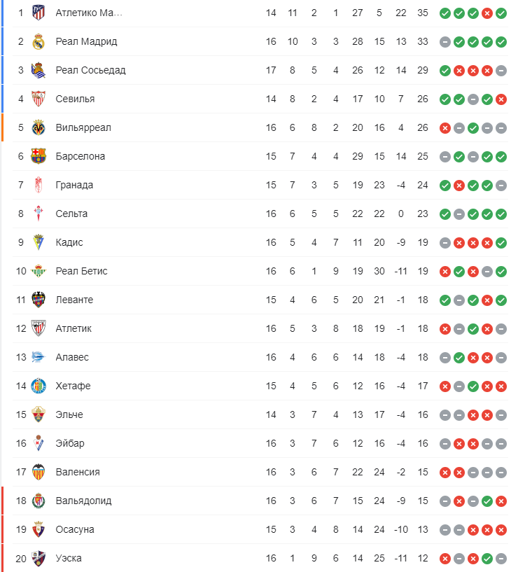 На данный момент турнирная таблица Ла Лиги выглядит таким образом: