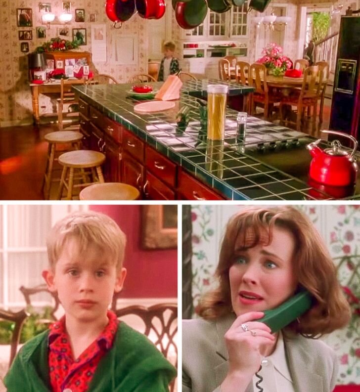 Стены, растения в горшках, кухня, мебель, домашний телефон, шарики и даже одежда героев неизменно окрашены в эти два цвета. Судя по всему, таким образом создатели картины решили сделать фильм максимально праздничным и «рождественским». Признайтесь, что раньше и не замечали этой детали.