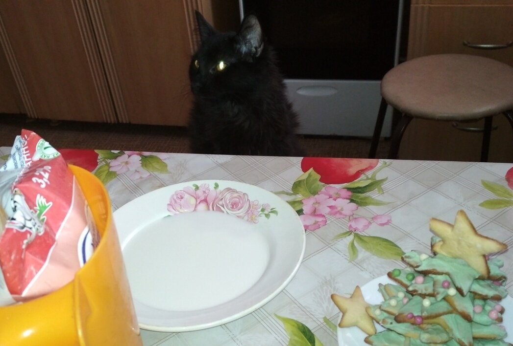 Стол стоял на месте, кувшин с молоком и ёлка оставались там, где она только что их поставила. Кот смирно сидел на табуретке, глядя на хозяйку честными зелёными глазами.
