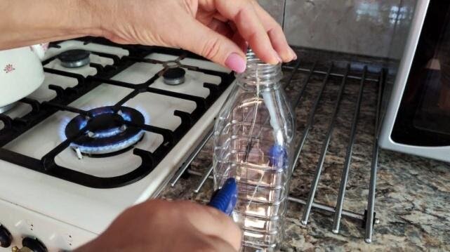 2. На каждой половинке бутылке рекомендуется сделать разметку под оси катушек, чтобы равномерно сделать отверстия горячими гвоздями или паяльником друг напротив друга.