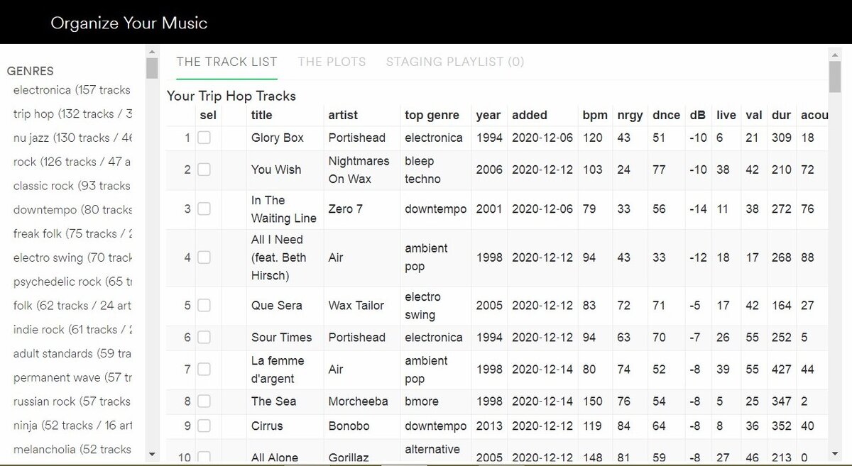 3. Для того, чтобы сориентироваться в любимых треках, увидеть статистику по любимым жанрам, сортировать свою библиотеку и плейлист, есть вот этот сайт http://organizeyourmusic.playlistmachinery.com/