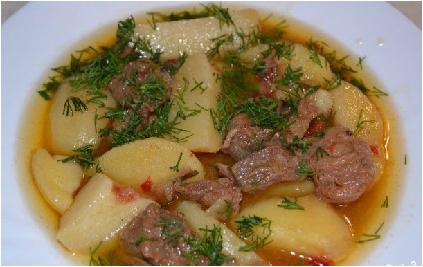 8. Прошел час. Отправляем картофель в кастрюлю к мясу. Солим и перчим. Тушим блюдо еще 20 минут.