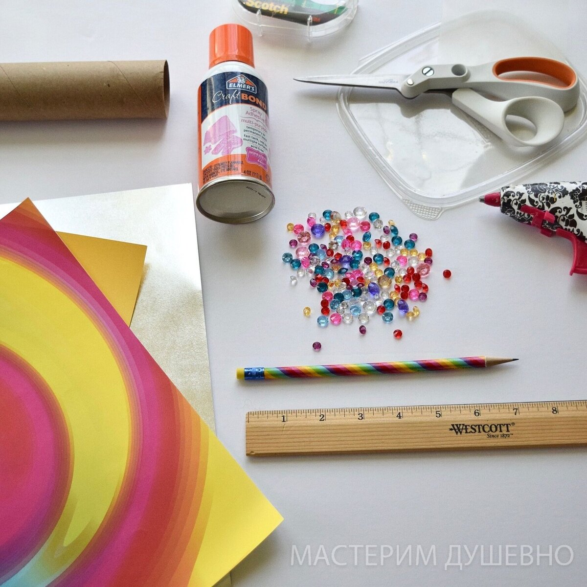 Когда клей высохнет, держите втулку бумажного полотенца вертикально и опустите внутрь заготовленные цветные прозрачные красивости (шарики, бусы, стразы, кристаллы...)