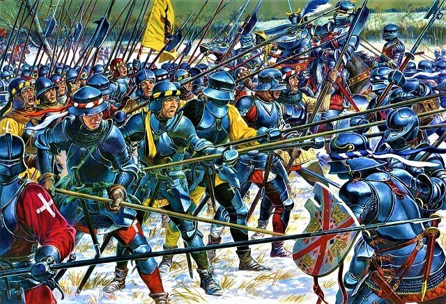 Следующие за пикинёрами 3-4 шеренги состояли из алебардистов. Алебарда – швейцарское изобретение, представлявшее собой гибрид пики и секиры – большой топор на длинной пике. Алебарда могла наносить рубящие удары сверху или колющие через промежутки передних рядов. Последние шеренги «баталии» также составляли пикинёры, длина их пик достигала 5,5 метров.