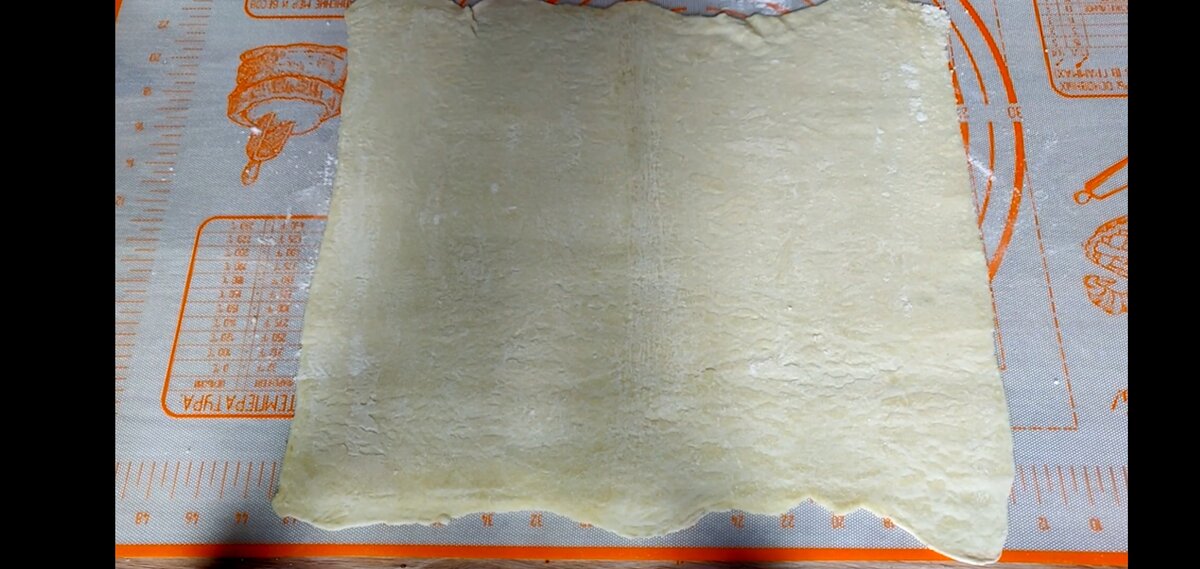 Нам понадобится слоёное тесто, у меня оно из магазина. Берём одну полоску и хорошо раскатываем.