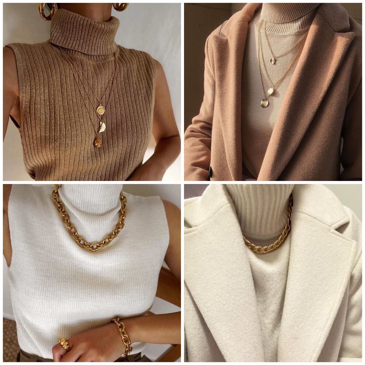 К однотонным водолазкам предлагаю выбирать довольно массивные украшения средней длины. Это могут быть особенно актуальные сейчас цепи. Также отлично будут смотреться сеты из нескольких некрупных цепочек. Комплекты с простыми водолазками мгновенно преображаются после добавления ожерелья.