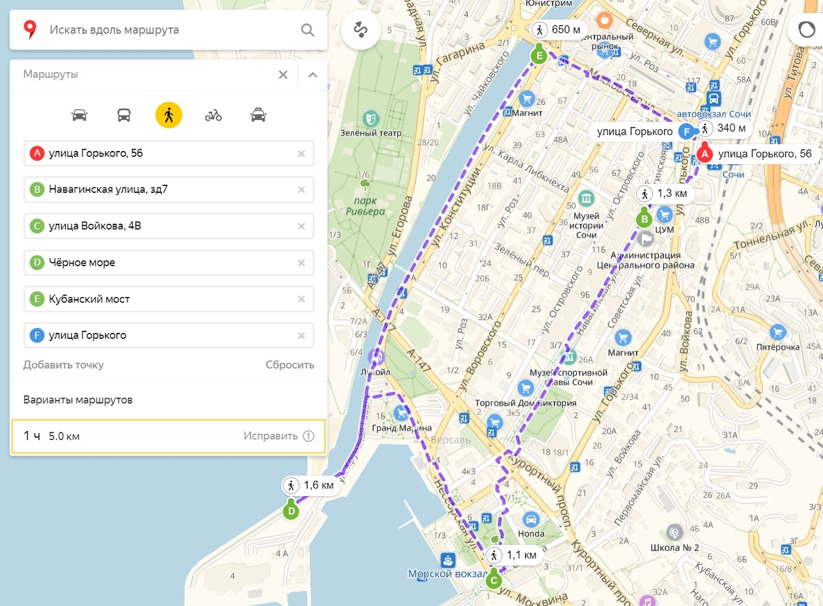 Начало: ЖД станция Мацеста или Курортный проспект (напротив остановки Мацеста). Завершение: Центральный стадион Сочи.