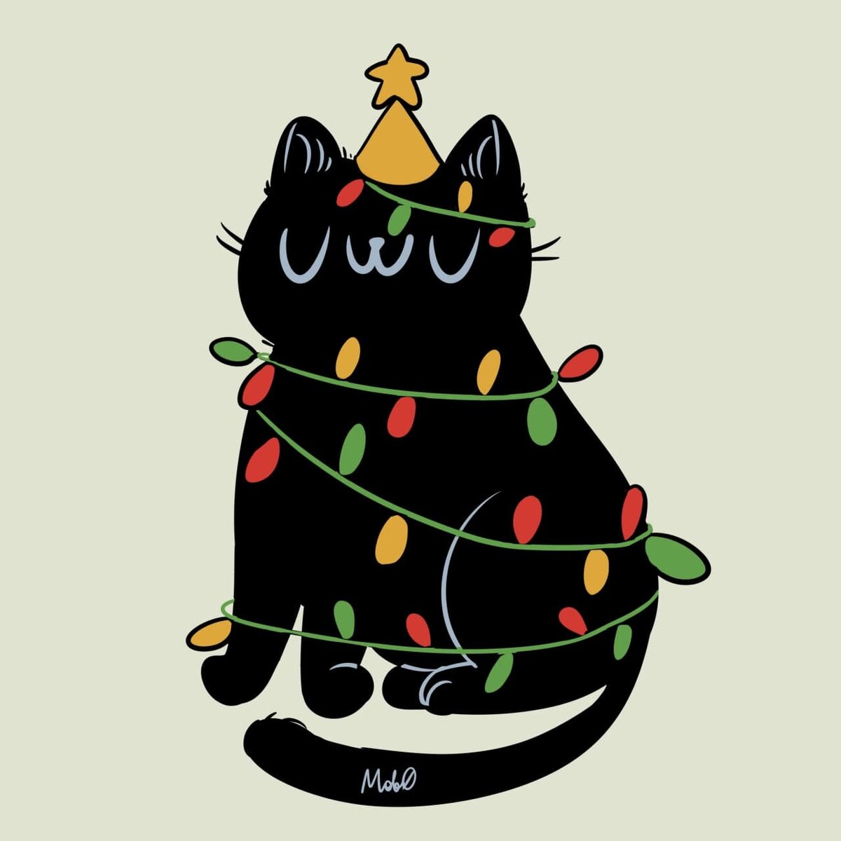 Скоро праздники , и чтобы создать волшебное настроение этот котик нарядился в елочку, ну или просто уронил ее и забрал себе ее украшения. Веселый праздничный черный кот в гирлянде и звездой на голове.