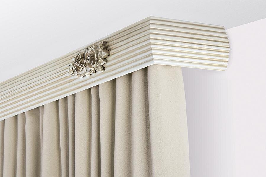 Деревянный карниз может быть украшен резьбой или декорироваться патиной с эффектом под старину. Проанализируйте стилистику своего интерьера, чтобы убедиться, что выбранная модель карниза будет смотреться органично. Массивные темные карнизы хорошо подойдут для больших комнат, для маленьких лучше выбирать не слишком увесистые конструкции и желательно в более светлых оттенках, чтобы визуально не перегружать пространство. Например, карниз Равенна «Вензель античный белый» будет хорошо смотреться в классическом интерьере, а карниз Дуэт «Мята» органично впишется в современную стилистику минимализма или #сканди.
