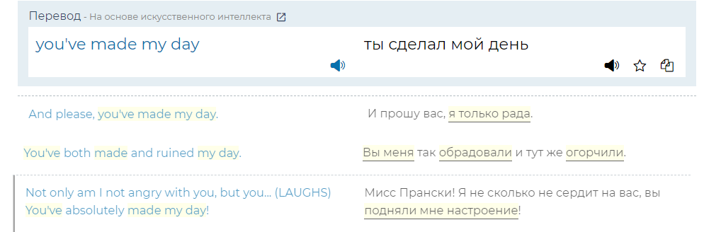 В повседневный оборот вошло английское выражение you've made my day. Вошло, конечно же, в виде кальки, то есть, пословного буквального перевода, который звучит хоть и ново, но угловато. Посудите сами, даже context.reverso.net выдает переводы этой фразы не совсем в том значении, которое получают от неё нейтивы: