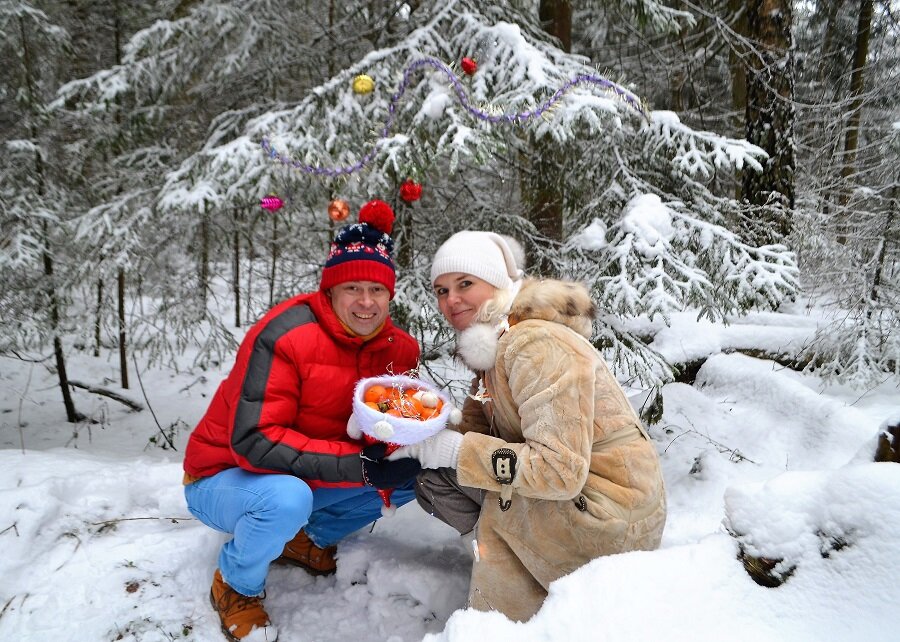 Интернет пестрит объявлениями новогодних фотосессий. Посмотрели мы на всё это, взяли фотоаппарат со штативом и отправились в лес. Живём мы в городе, но до леса рукой подать. Удачное месторасположение. Так вот, собрали мы свой волшебный рюкзачок с новогодним декором, захватили термос с горячим чаем, сладостей. По дороге заскочили в магазин купить мандаринов, созрела идея для кадра. И вот мы на месте. Нашли ёлочку, усыпанную снегом, повесили несколько шариков. И понеслось...