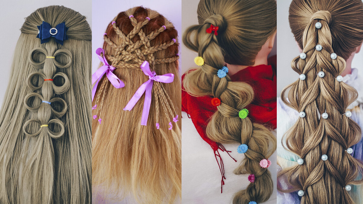 Причёска на хвостиках. Косички можно заплетать с лентами. Бусины взять разноцветные.