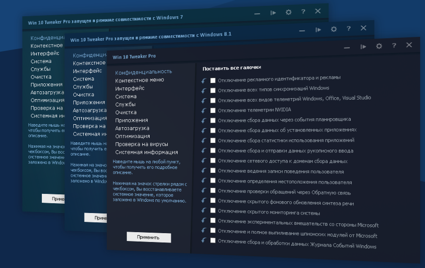 Существует очень много приложений для ускорения работы Windows 10, но лучшей для себя я обозначил Win 10 Tweaker. Простой интерфейс и огромное количество возможностей сделать систему красивее, функциональнее, а самое главное - быстрее.