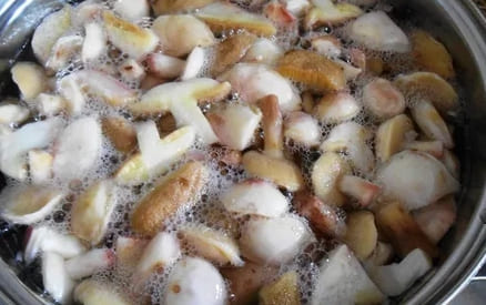 Свежие грибы кладут в питьевую воду и доводят до кипения. Затем – меняют воду на соленую и варят около 30 минут. Кастрюлю не накрывают крышкой. При использовании мультиварки выбирают режим «Тушение» и заводят таймер на 40 минут.