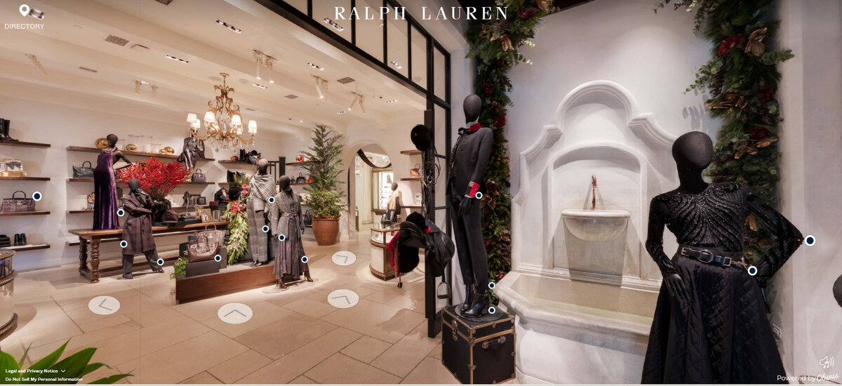 Ralph Lauren предлагает несколько точных онлайн-копий своих офлайн-магазинов. Например, магазин-реплика Беверли-Хиллз имеет гораздо более комплексный интерфейс, чем World of Joy от Cost Plus World Market. Боковое меню со списком отделов избавляет от необходимости «ходить» по пространству, чтобы добраться до определённого отдела. Музыкальное сопровождение также добавляет праздничной атмосферы. А поскольку это онлайн-реплика реального магазина, интерьер обладает всей роскошью и глубиной самого исходника.