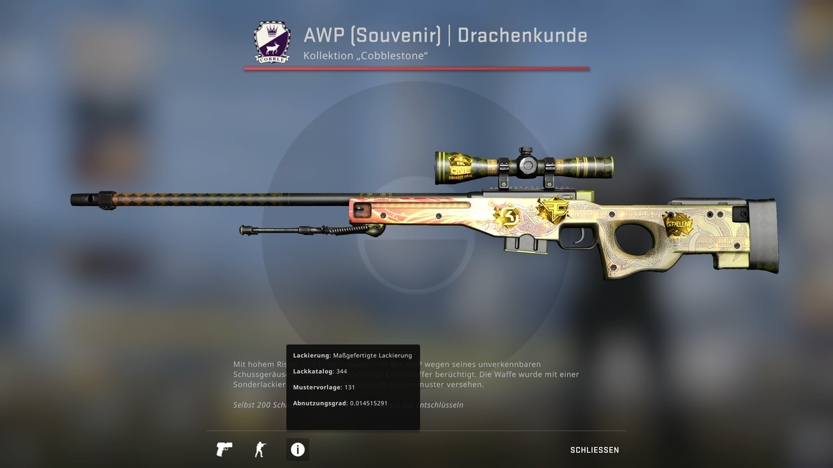 Человеческий фактор сыграл свою роль, и всевидящему csgofloat удалось одним глазком заглянуть в сокровищницу HFB - эти богатства поразят любого. До сих пор №1 по флоту сувенирной Историей о драконе считался 0.042, однако его сместили сразу ДВА экземпляра - 0.026 и 0.0145! Самое безумное то, что все сувенирные "легенды" оказались лишены самого ценного, золотых стикеров, которые он стёр лично - настолько его не заботила девственная красота бесценных сувениров. Также 3-я в мире поношенная AWP была обнаружена на аккаунте, тоже утратившая наклейки