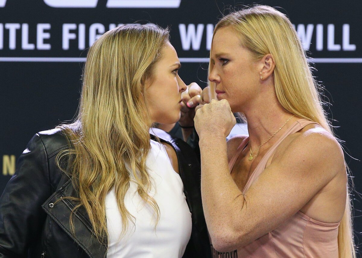 Начнем с женского дивизиона: две американки Ронда Роузи и Холли Холм сошлись в легендарном бою за звание чемпионки UFC в легчайшем весе.