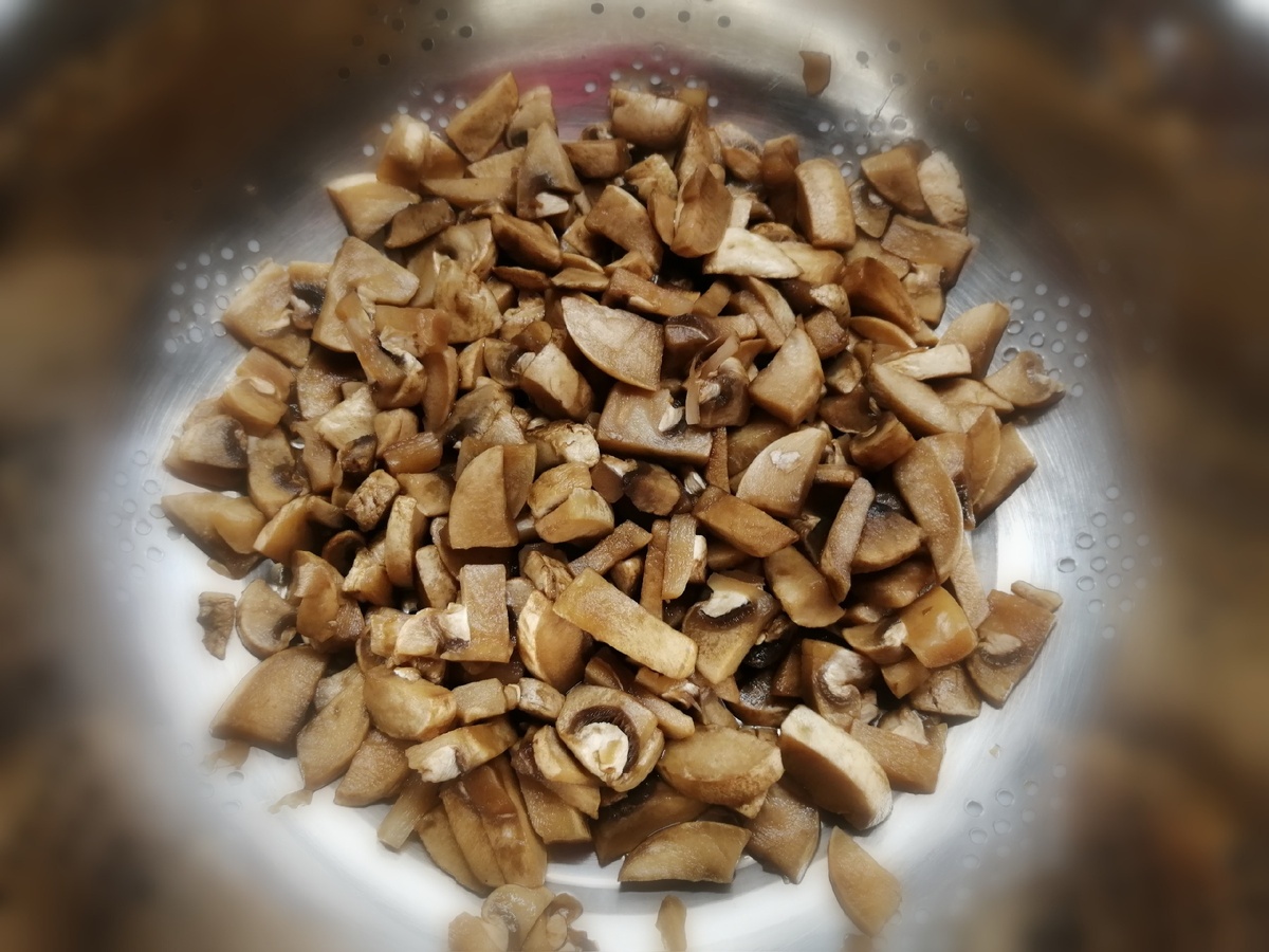 Нарезаем грибы, у меня шампиньоны, хорошо промываем, и даём воде стечь