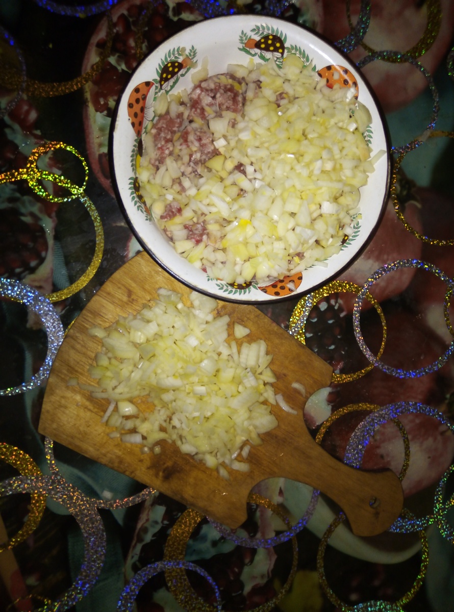 1)режем мелко лук и добавляем к фаршу, не забываем посолить и поперчить(простите за плохое фото, не проверила качество)