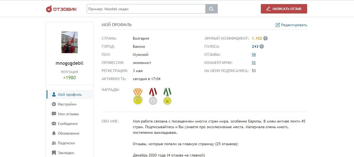3.4 В разделе "Мой профиль", строка "Обо мне", обязательно напишите, информацию, которая совпадает с тематикой отзывов, которые Вы будете писать. Пример: я пишу о путешествиях, о экскурсиях, отелях где я был.