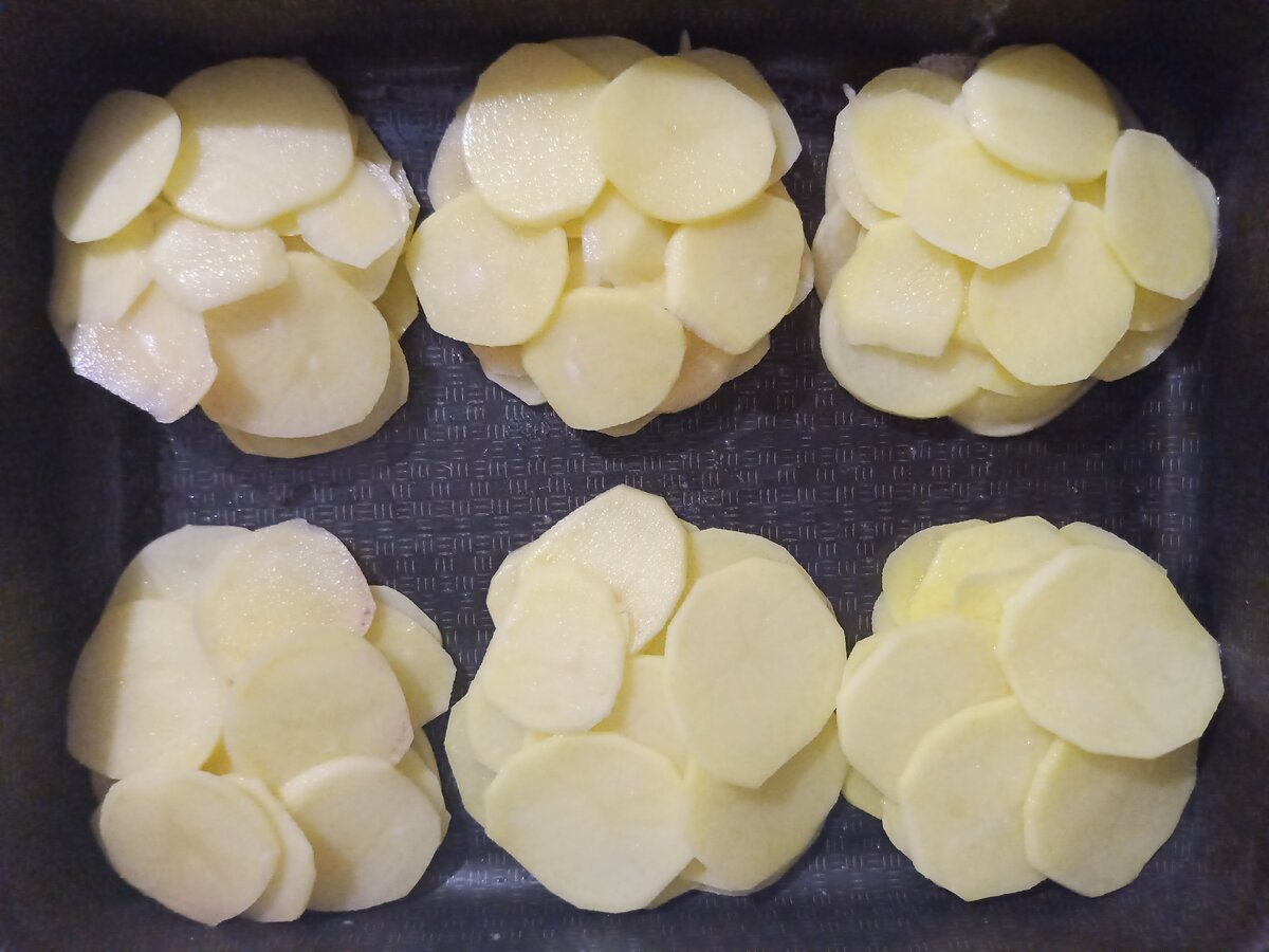 Выкладываем картофель порционными "кучками". Я делаю 3 слоя картофеля, каждый слой посыпаю солью и перцем.