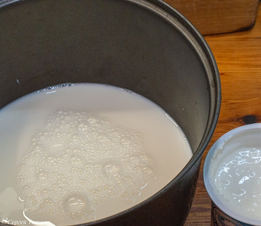 В чашу мультиварки наливаем молоко и туда же отправляем примерно 200 грамм термостатного йогурта, который купили в магазине для закваски. На мультиварке ставим режим «Йогурт». Я поставил на ночь. Вечером сделал, а утром уже все готово! Получается, что установка отработает примерно сорок минут. Мультиварку при этом нельзя открывать до самого конца завершения процесса приготовления. До утра.