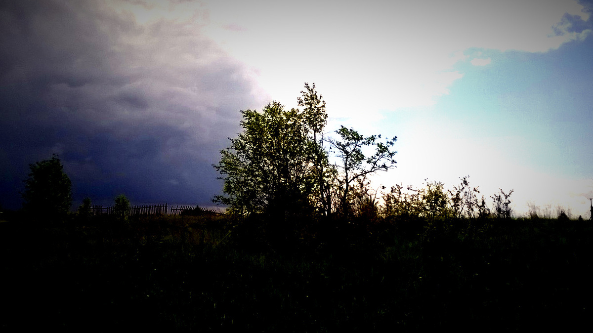 Одна из моих любимых фотографий. Как-то возвращался с дачи пешком, в ушах музыка, а перед глазами чистое небо и сияющее Солнце. И тут из-за спины на меня начал капать дождь. Поначалу грибной, но с каждым шагом капли становились все увесистее. Я не выдержал и обернулся посмотреть, кто меня поливает с небес. Словами не описать то, как на меня стремительно надвигалась чернейшая туча, которая