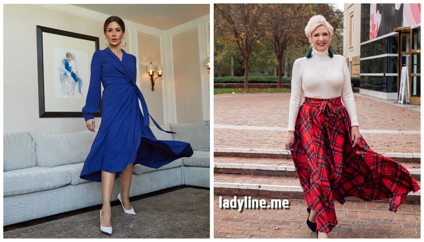 Шелковое или хлопковое платье на запах миди длины комплементарного алого или темно-синего цвета - праздничный наряд, который сделает любую женскую фигуру идеальной. Акцент на талии и глубокое декольте скроют некоторые несовершенства фигуры, а также подчеркнут ее достоинства.