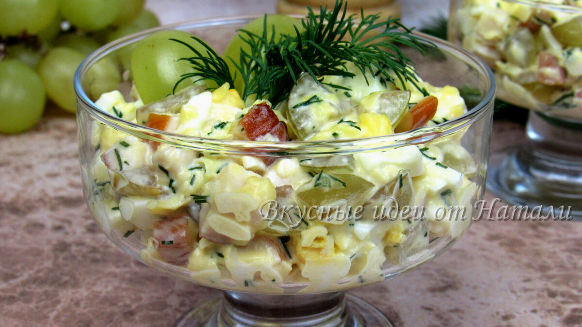 Очень вкусный салат с копченой курицей. Чтобы его приготовить, потребуется не больше 10 минут, поэтому готовится он предельно просто и быстро. Все ингредиенты салата отлично сочетаются между собой и дополняют вкус друг друга, благодаря чему действительно получается потрясающе вкусный салат. Замечательный вариант салата и на праздничный стол, и на каждый день. *************************************************************************** 👇 Процесс приготовления и список ингредиентов смотрите ниже 👇 *************************************************************************** ПРОЦЕСС ПРИГОТОВЛЕНИЯ: 1. Копченую курицу порезать на кубики небольшого размера. 2. Виноград также порезать на небольшие кусочки, в процессе вынимая косточки. 3. Яйца нарезать кубиками (я нарезала с помощью яйцерезки/винегретницы (металлической сетки)). 4. Твердый сыр натереть на средней или крупной терке. 5. В последнюю очередь мелко нарезать укроп. 6. Смешать все ингредиенты в салатнике. Перемешать. 7. Добавить майон