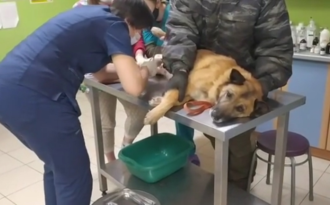 У собачки Гайки, которую хозяева с опухолью вернули в приют после 2 лет жизни дома, вчера разошлись швы после операции, пришлось снова везти в клинику и снова зашивать, это довольно не приятная и затратная процедура(.