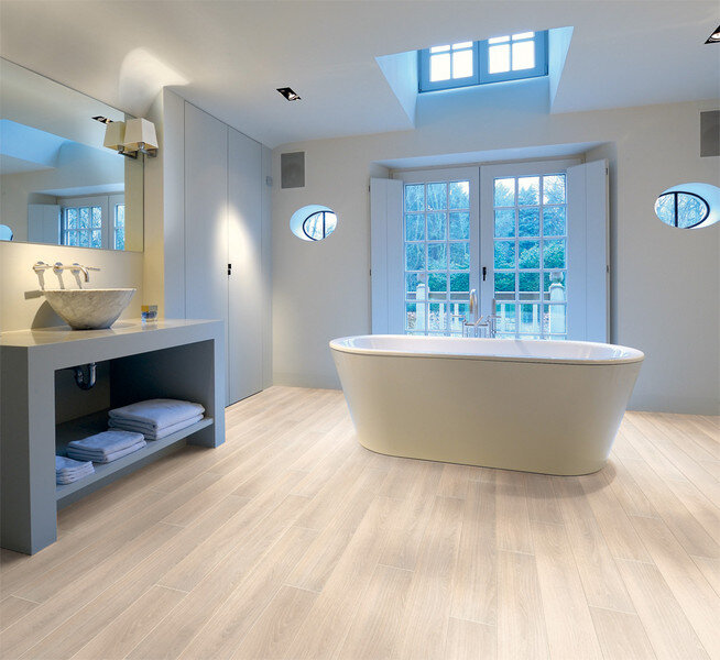 Водостойкий ламинат– лучший вариант для укладки в ванных комнатах и неотапливаемых помещениях. Имеет очень низкий уровень водопоглощения – менее 2%. Такой материал вполне пригоден для укладки в ванных комнатах, банях и других помещениях, для которых характерен не только высокий уровень влажности, но и вероятность прямого контакта напольного покрытия с водой, в том числе горячей.