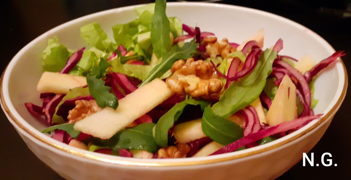 На тарелку выложить листья салата,капусту,яблоко и грецкий орех