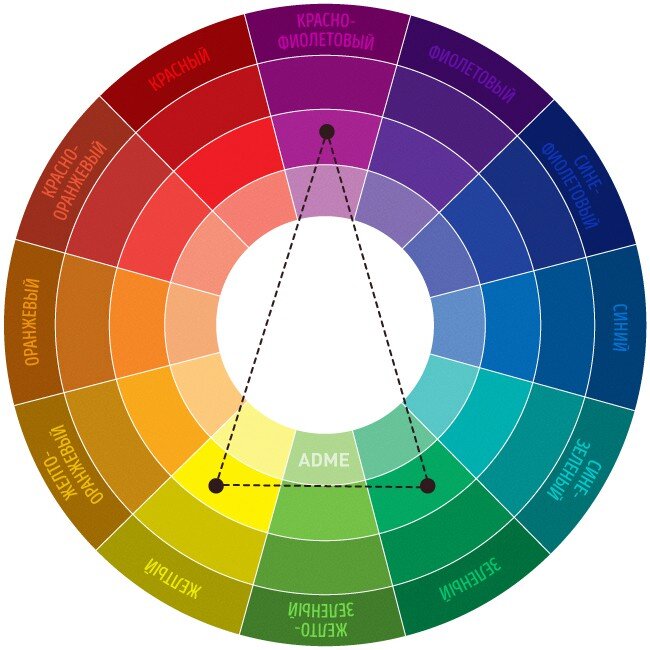 Существуют законы гармоничного сочетания цветов – для их соблюдения можно пользоваться вот таким кругом, сочетая цвета, которые расположены друг напротив друга. Если цветов необходимо больше, чем 2, пользуйся методом треугольника, который изображен на рисунке: